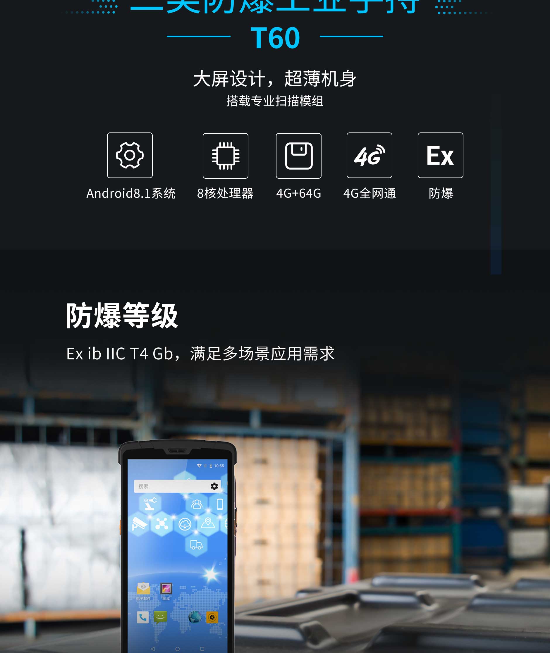 T60-EX支持4G全网通(移动、联通、电信全网数据业务及电话业务支持)。支持wifi、蓝牙等无线通讯,能更加快速的处理数据业务。Android 8.1的系统平台,更加稳定的为企业提供良好的服务。支持一维、二维、RFID、打印等诸多功能,具有高可靠性及高扩展性,适用于各个行业移动式业务逻辑的需求。